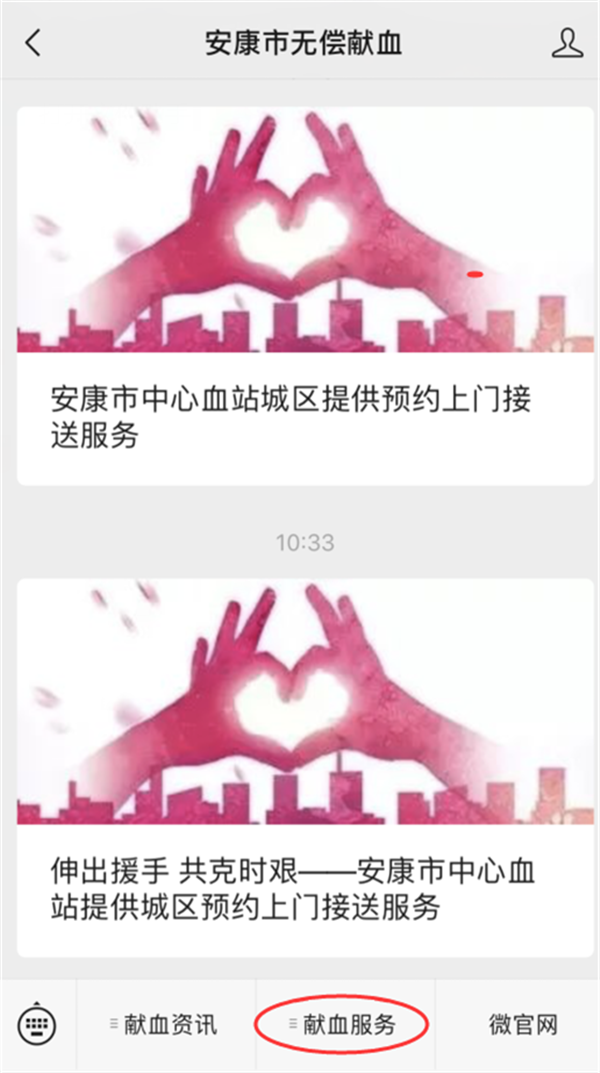 同時(shí)安康市中心血站公眾號開放獻(xiàn)血預(yù)約渠道,(如圖示)在關(guān)注安康市無償獻(xiàn)血公眾號后,在最下方菜單欄選擇“獻(xiàn)血服務(wù)”——“獻(xiàn)血預(yù)約”——填寫相關(guān)信息,便可完成預(yù)約。