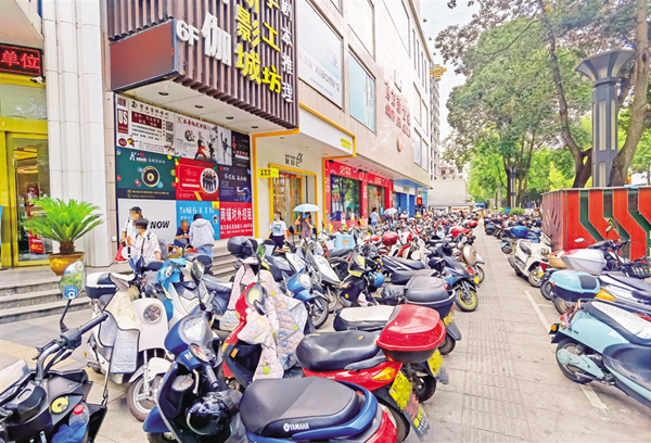 6月18日,在安康城區(qū)金州南路人行道上,部分車(chē)輛占用盲道、車(chē)身超出停車(chē)線(xiàn)(圖1),未按要求停放車(chē)輛(圖2),造成了安全隱患。(記者 張喬 攝)