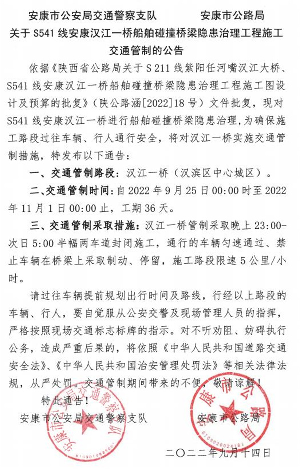 9月25日至11月1日安康漢江一橋?qū)⑦M(jìn)行船舶碰撞橋梁隱患治理工程施工,將對(duì)漢江一橋?qū)嵭?strong>交通管制36天,管制采取晚上23:00-次日5:00半幅兩車道封閉施工,通行的車輛勻速通過(guò),禁止車輛在橋梁上采取制動(dòng)、停留,施工路段限速5公里/小時(shí)。