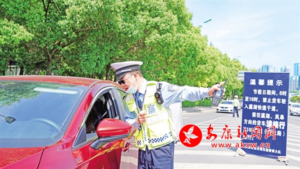 5月1日,在瀛湖快速干道與三橋北交匯路口,漢濱交警大隊民警為游客介紹前往瀛湖景區(qū)情況。汪海玉 攝