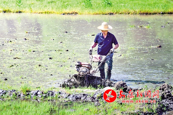 5月1日,石泉縣城關(guān)鎮(zhèn)絲銀壩村百畝水田里,農(nóng)戶操作旋耕機做好插秧前的各項準備工作。董長松 攝