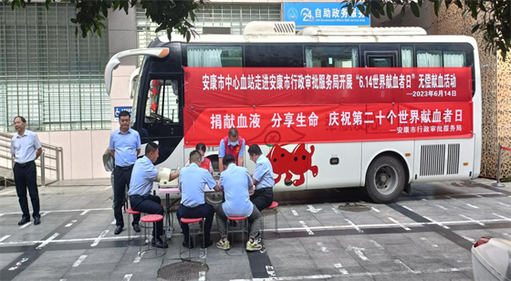 2023年6月14日,在第二十個世界獻血者日當天,安康市中心血站聯合市行政審批服務局開展了“文明有我 無償獻血 傳遞溫暖”無償獻血志愿服務活動。