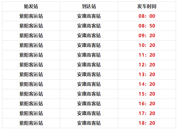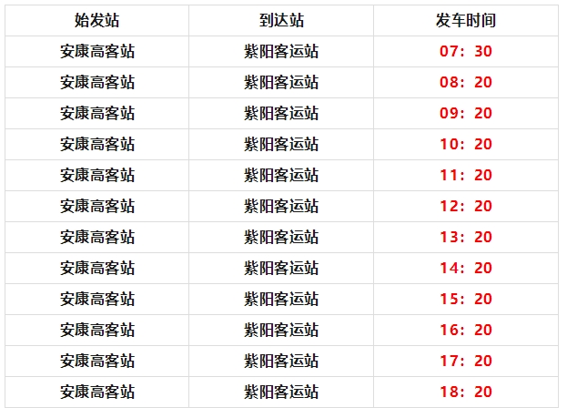 由紫陽客運(yùn)站發(fā)往安康高速客運(yùn)站,每日12班,發(fā)車時間為: