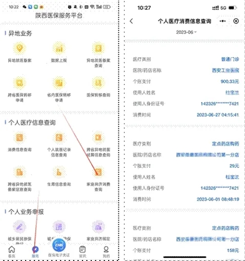 在“陜西醫(yī)?!盇PP“服務”界面,選擇家庭共濟消費查詢功能,授權者可查詢到使用者的家庭共濟消費情況。