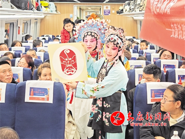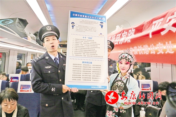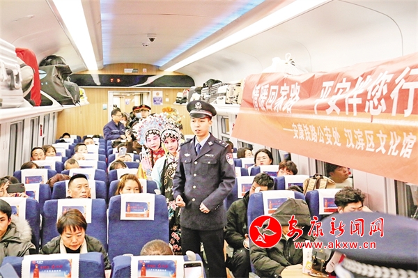 火車穿越秦巴山水間,途中,來自安康漢調二黃研究院的專業(yè)演員和地方民間漢調二黃愛好者們一同表演了國家級非物質文化遺產(chǎn)——漢調二黃經(jīng)典戲曲演唱,并為旅客們講解漢調二黃戲曲知識,與旅客們開展互動交流,讓旅客親身體驗漢調二黃戲服道具,感受漢調二黃的獨特藝術魅力。來自漢濱區(qū)文化館的漢濱剪紙技藝傳承人為旅客們展示講解了安康市級非物質文化遺產(chǎn)——漢濱剪紙技藝,向參與互動的旅客送上了親手創(chuàng)作的漢濱剪紙作品,提前送上新春祝福?;顒又校靼茶F路公安局安康公安處的民警們和文藝工作者們一同宣傳普及了反詐知識,進一步提升旅客的安全防范意識。