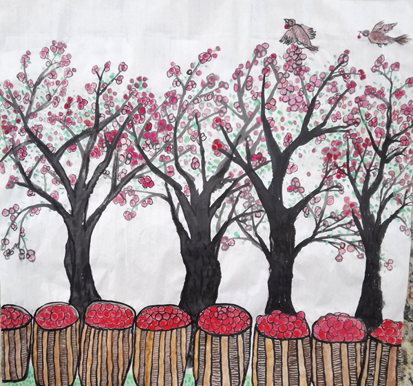 學(xué)校國畫社團(tuán)的孩子們,經(jīng)過兩天的緊張培訓(xùn)、繪制草圖、精心創(chuàng)作,十余名學(xué)生畫出了美麗鄉(xiāng)村的豐收場景,畫出了孩子們美好生活的快樂情趣,也畫出了漢調(diào)二黃戲劇人物水墨畫印象,從多角度贊美了美麗家園、幸福安康。在安康兒童美育專家宋安平和鄭字堂、王彬等老師的精心輔導(dǎo)下,孩子們的國畫作品,將選送參加中央美術(shù)學(xué)院少兒美術(shù)研究中心主辦的展覽。