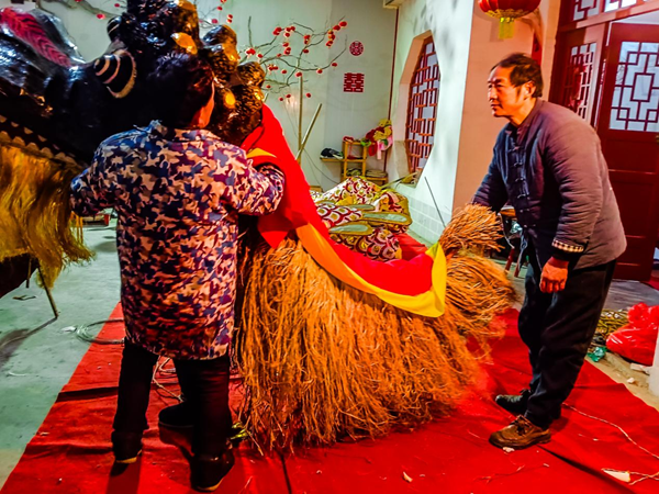 “龍頭是整條龍的重點,刻畫要逼真,色彩還得鮮艷。忙碌了一年的鄉(xiāng)親們,就希望在正月里,抖擻精神,舞動起來。”說話間,李忠寶一雙巧手上下翻飛,正在修剪龍頭花燈的胡須,忙得額頭沁出了汗珠。兒子李石磊則忙著幫烤、粘、填、糊、上色……在他們父子倆的精雕細琢下,一個威風凜凜、栩栩如生的花燈道具龍頭,總算扎制完成。