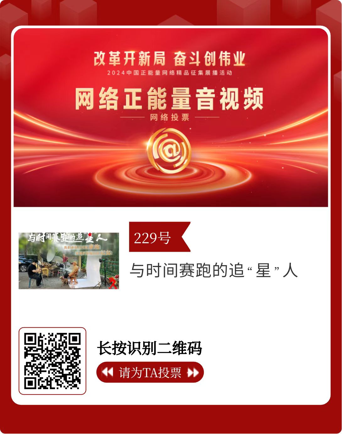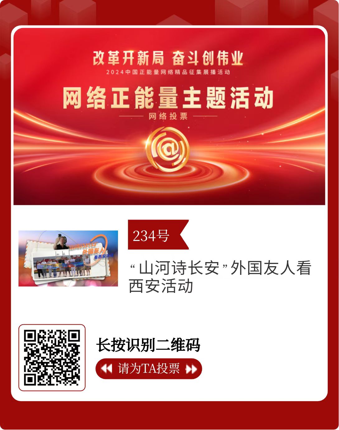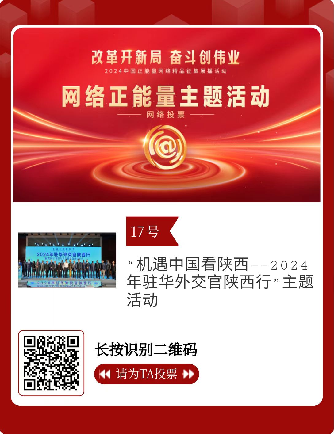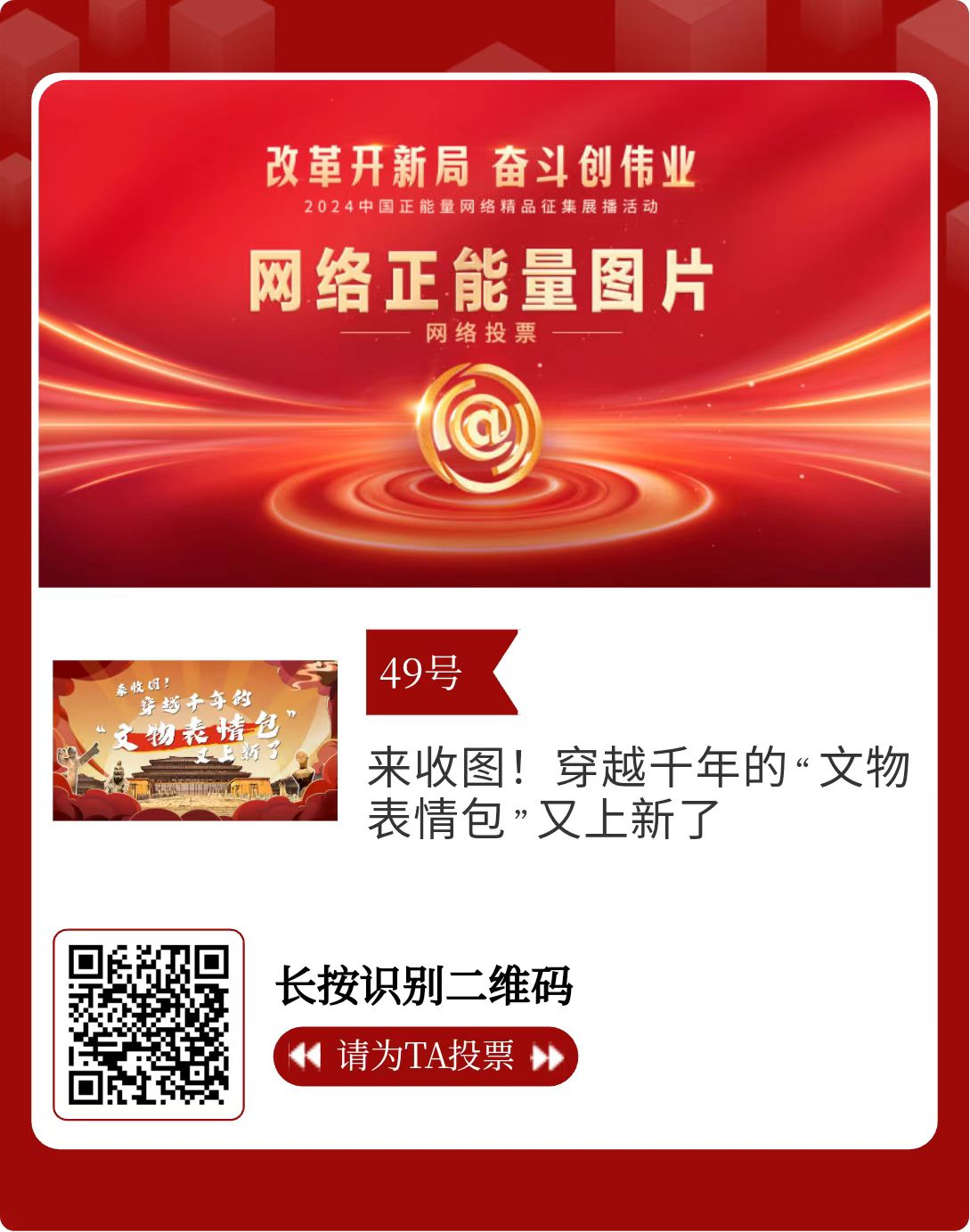 改革開(kāi)新局,奮斗創(chuàng)偉業(yè)。由中央網(wǎng)信辦主辦的2024中國(guó)正能量網(wǎng)絡(luò)精品征集展播活動(dòng)今天啟動(dòng)網(wǎng)絡(luò)展播投票。