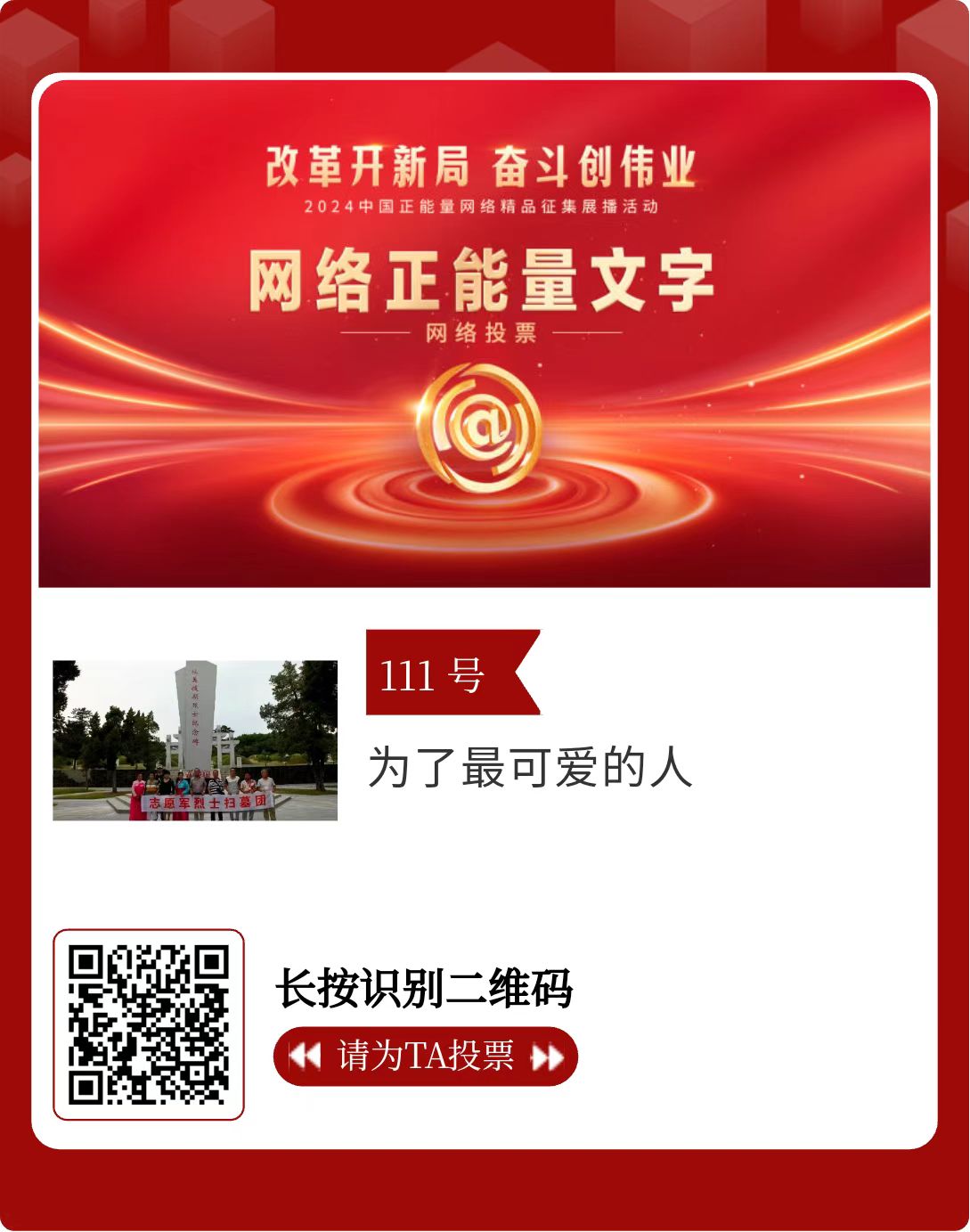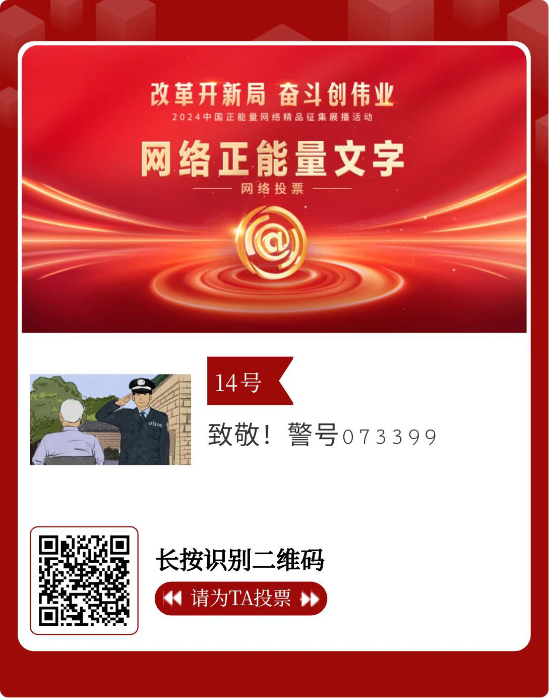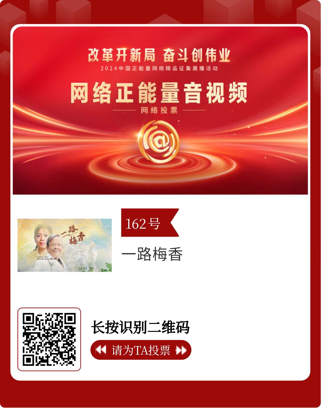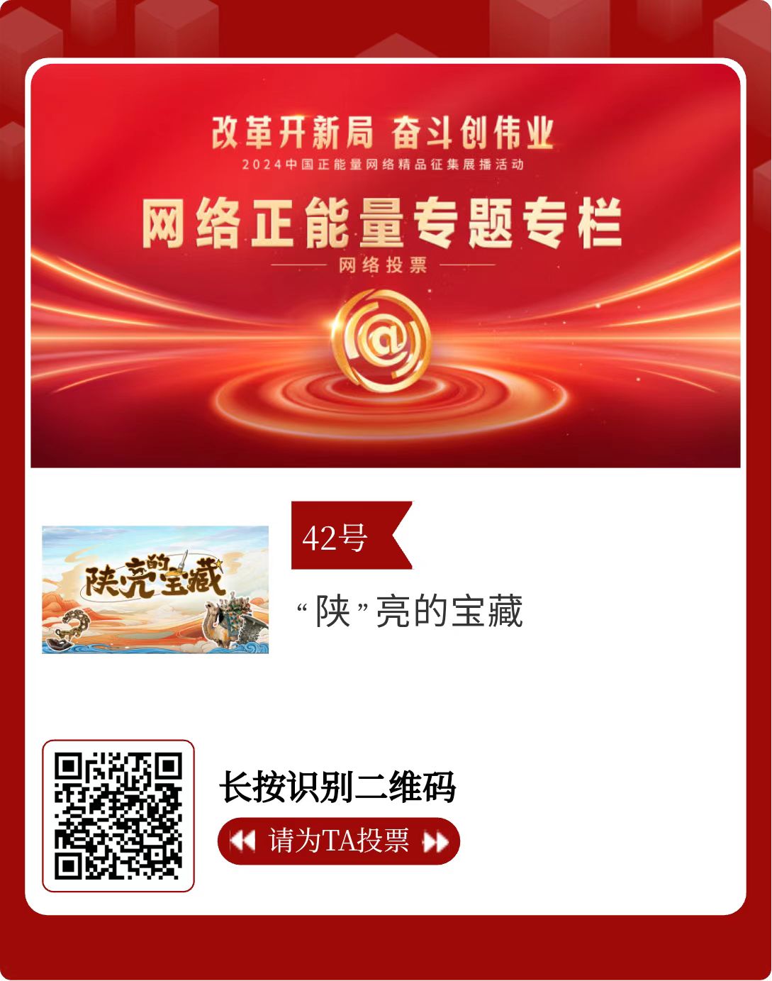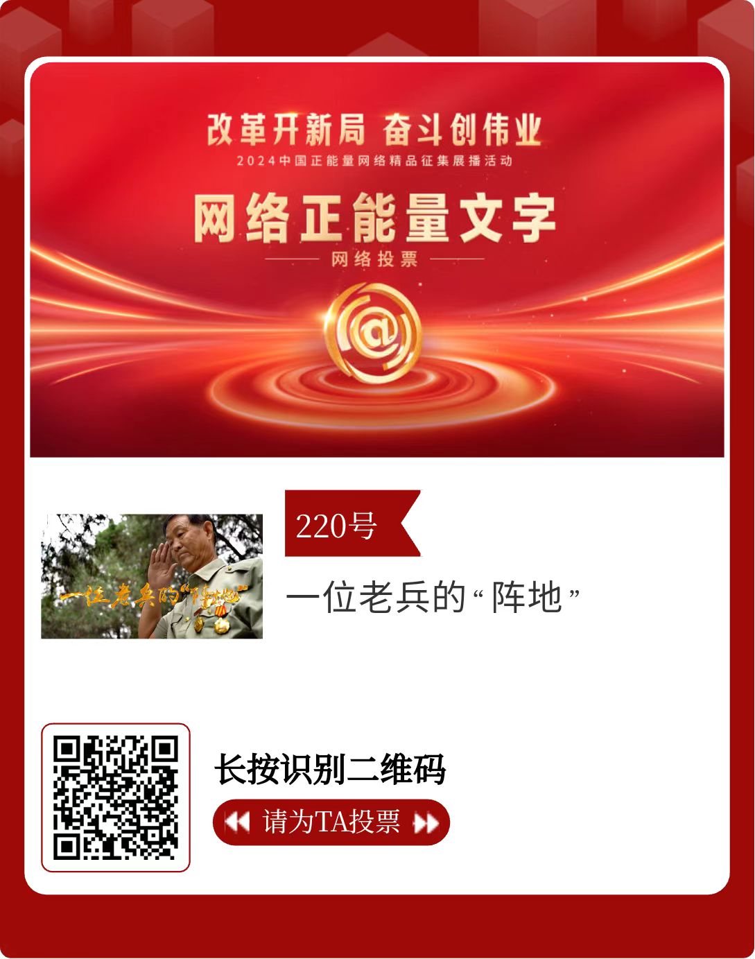 改革開(kāi)新局,奮斗創(chuàng)偉業(yè)。由中央網(wǎng)信辦主辦的2024中國(guó)正能量網(wǎng)絡(luò)精品征集展播活動(dòng)今天啟動(dòng)網(wǎng)絡(luò)展播投票。