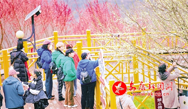 石泉縣濱江大道上紅梅競相綻放,廣大游客駐足觀看,打卡留念。譚文昌 攝?