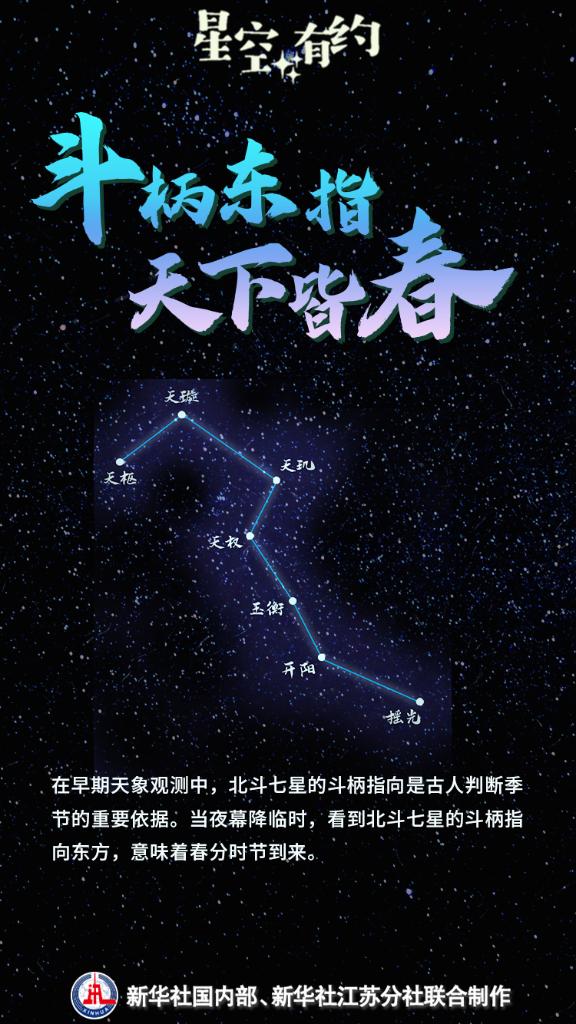 3月20日將迎來春分節(jié)氣。這一時節(jié)草長鶯飛、花滿枝頭,天上的星斗也指示著春天的到來。我國古代有“斗柄東指,天下皆春”的說法,意思是當夜幕降臨時,看到北斗七星的斗柄指向東方,意味著春分時節(jié)到來。