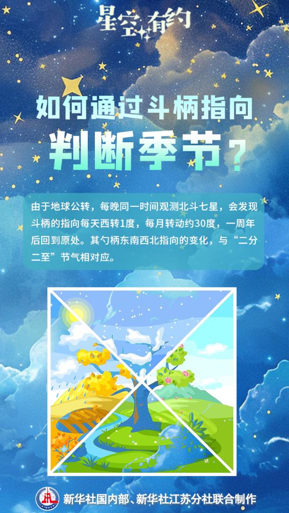 中國科學院紫金山天文臺科普主管王科超介紹,北斗七星是大熊座的一部分,由七顆明亮的恒星組成勺子形狀,它們是北半球夜空中的標志性星群。七星中,四顆星排列成斗勺,其余三顆星排列成斗柄。由于地球繞日公轉,每晚同一時間觀測北斗七星,會發(fā)現斗柄的指向每天逆時針向西轉1度,每月轉動約30度,一周年后回到原處,與季節(jié)輪回基本一致。