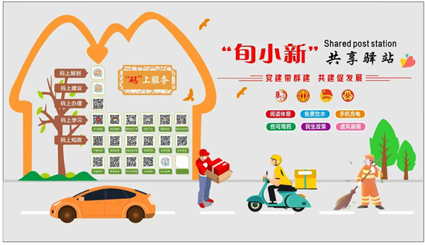 “旬小新”共享驛站按照“黨建帶群建 共建促發(fā)展”思路,秉持“需求前置、服務(wù)賦能”理念,通過(guò)整合行業(yè)部門(mén)、企業(yè)、社會(huì)三方資源,著力構(gòu)建“15分鐘暖新服務(wù)生態(tài)圈”,為快遞員、外賣(mài)騎手等新就業(yè)群體提供閱讀休息、免費(fèi)飲水、手機(jī)充電、應(yīng)急藥箱等18項(xiàng)基礎(chǔ)服務(wù)設(shè)施。
