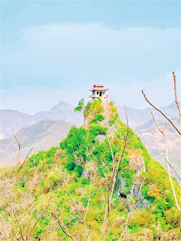峭壁之上,是一座正在修建的觀景臺,亭子雖不大,但是飛檐翹角,白墻黛瓦,矗立在山頂,也顯得頗為偉岸。站在觀景臺上俯瞰山谷,任山風(fēng)拂面,頓覺神清氣爽,油然而生一種“一覽眾山小”的自豪。