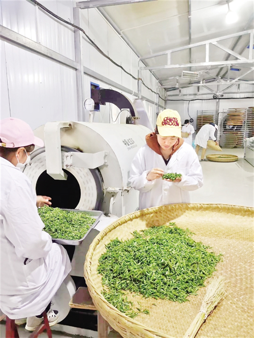 沿著九曲山路攀至絲鋪村五龍山,1200米的海拔高地,500畝生態(tài)茶園豁然舒展在眼前。茶農(nóng)們星羅棋布地穿梭在茶園,夏茶葉紛紛從茶樹間跌落。“高山茶回甘足,這片云海就是天然保鮮庫?!贝逯Р繒洸碳椅妮p捻茶葉,陣陣清香沁人心脾。旬陽五龍山農(nóng)民種植專業(yè)合作社負責人王志富打開茶廠卷簾門,生產(chǎn)線熱氣蒸騰?!叭ツ晡覀兪召徚?000公斤鮮葉,加工了1000公斤干茶,產(chǎn)值達到30萬元,輻射帶動周邊村民端穩(wěn)飯碗。”