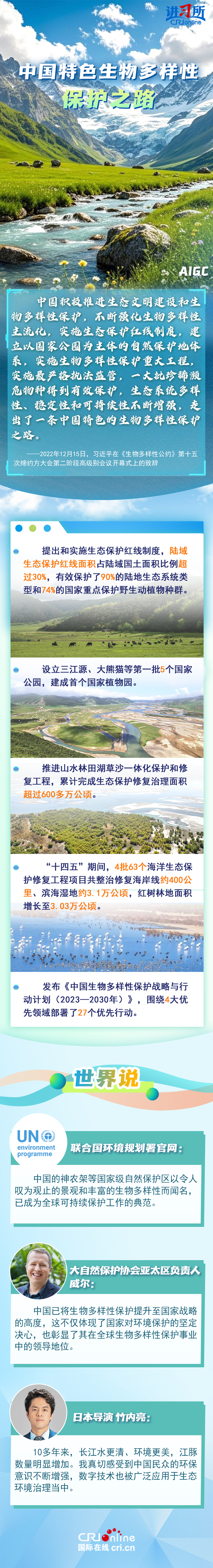 “心往一處想、勁往一處使,共建地球生命共同體?!弊鳛樽钤绾炇稹⑴鷾省渡锒鄻有怨s》的締約方之一,生物多樣性保護已經(jīng)上升為中國的國家發(fā)展戰(zhàn)略。國際人士表示,中國的一系列舉措體現(xiàn)出對生態(tài)環(huán)境保護的堅定決心,同時,中國依托共建“一帶一路”倡議等國際合作機制,為推動全球生物多樣性保護提供了有力支持,在邁向自然友好型未來的過程中發(fā)揮關(guān)鍵的引領(lǐng)作用。