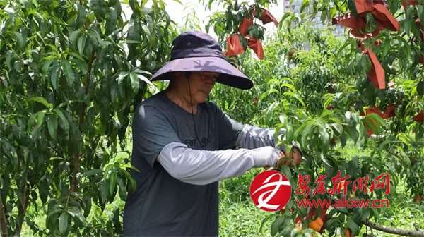 同樣迎來收獲的還有城關(guān)鎮(zhèn)的黃桃,在城關(guān)鎮(zhèn)龍嶺村的黃桃種植基地,連片的桃樹郁郁蔥蔥,金燦燦的黃桃壓彎了枝條,空氣中彌漫著誘人的桃香。基地負(fù)責(zé)人劉宏正忙著采摘,臉上洋溢著燦爛的笑容,他一邊采摘一邊介紹道:“我們這個(gè)桃園有金鳳黃桃、黃金黃桃、秋彤桃和冬桃四個(gè)品種,一共有9畝多,從6月中旬到10月左右,陸續(xù)都有成熟的桃子?!?/p>
