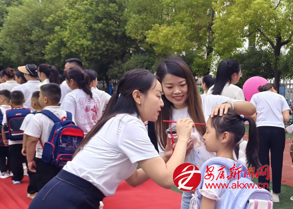 走紅毯環(huán)節(jié)將氛圍推向高潮。班主任帶領(lǐng)新生與家長手牽手緩緩前行,周圍的歡呼聲此起彼伏,孩子們?cè)谶@份熱鬧中,真切感受到“成為小學(xué)生”的榮譽(yù)感?!懊6Y”環(huán)節(jié)巧思滿滿,8種寓意吉祥的物品整齊擺放,孩子們懷著好奇伸手觸摸,在指尖的互動(dòng)中,收下滿含期許的祝福。