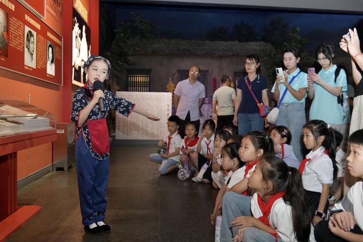 2025年8月7日,在山東省臨沂市沂蒙革命紀(jì)念館,沂蒙紅孩子文藝先鋒隊(duì)的房沫昕在講述紅色故事《沂蒙紅嫂祖秀蓮》。2024年9月,位于沂蒙革命老區(qū)的山東省臨沂市以“傳承沂蒙精神”為宗旨組建沂蒙紅孩子文藝先鋒隊(duì),通過(guò)歌舞、朗誦、故事講述、舞臺(tái)劇等紅色主題文藝節(jié)目,增強(qiáng)紅色文化感染力,不斷為紅色基因代代相傳注入新生力量。