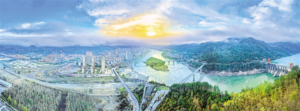11月19日,石泉縣城晨光初照,金輝灑落漢江,霧從群山間奔涌而出,冬景美不勝收。董長(zhǎng)松 攝