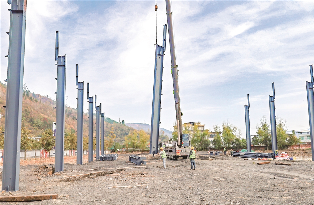 11月26日,紫陽高新區(qū)冷鏈倉儲物流園項目第一批鋼構(gòu)材料進(jìn)場,工人們正在開展吊裝作業(yè)。 肖昌尉 攝