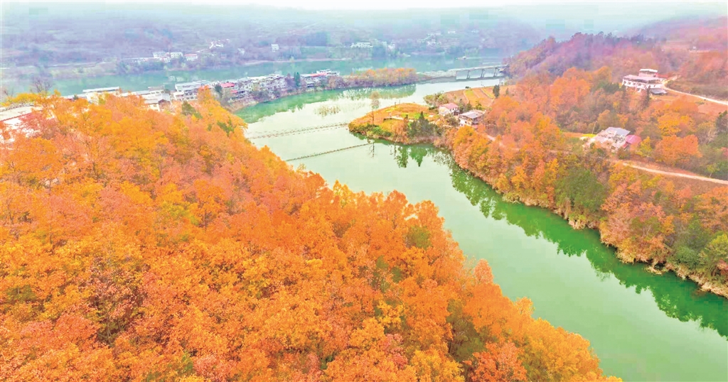 夕陽下的沙坪河,斑斕山林與澄澈水色繪就成一幅靈動的水鄉(xiāng)畫卷。郭浩 攝