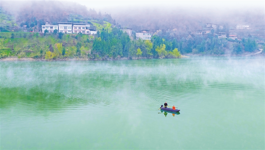 寒冬時節(jié),瀛湖蓄水,沙坪河展現(xiàn)出不同往昔的靜謐風(fēng)姿。清晨,薄霧如紗,輕輕覆于江面。遠山輪廓在氤氳中淡去,近水卻愈顯澄明,倒映著天際微光。時有早行的客船從霧中緩緩現(xiàn)出身形,馬達聲不時驚起三兩水鳥;漁人輕搖小舟,如在云中穿行。這朦朧流動的晨景,恍若水墨漫染的仙境。
