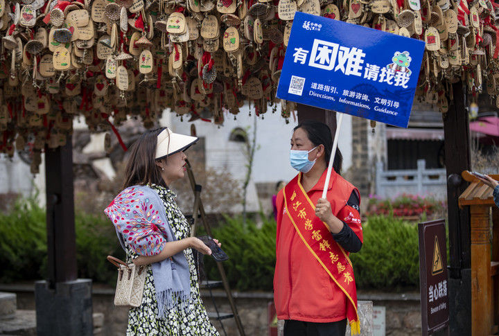 2023年5月18日,一名游客(左)在麗江古城向志愿者咨詢(xún)。2015年12月,云南麗江古城保護(hù)管理局牽頭成立了麗江古城旅游志愿者服務(wù)隊(duì),志愿者主要來(lái)自市區(qū)機(jī)關(guān)單位、古城保護(hù)管理局、古城經(jīng)營(yíng)戶(hù)、在校學(xué)生、社區(qū)居民等,常年在古城內(nèi)提供旅游咨詢(xún)、道路指引、文明引導(dǎo)等志愿服務(wù)。