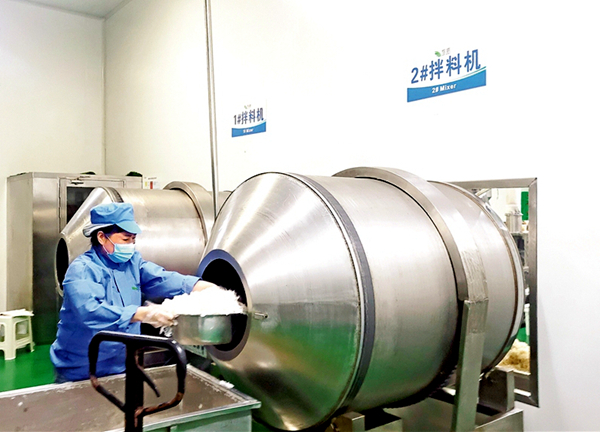 魔芋制品企業(yè)調(diào)味師將產(chǎn)品裝入攪拌機