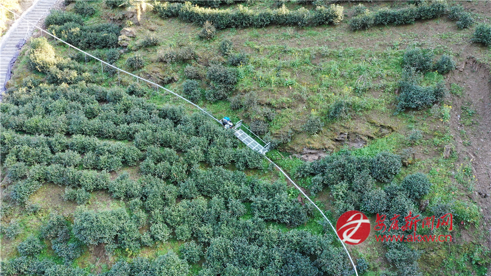 (圖為蘇陜項(xiàng)目支持建設(shè)的煥古鎮(zhèn)大連村軌道車上山運(yùn)輸鮮葉)