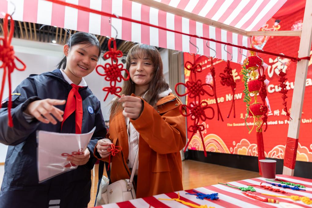 2024年1月28日,復旦大學第二附屬學校學生(左)為美國馬斯卡廷中學學生(右)介紹中國結。新華社記者 王翔 攝