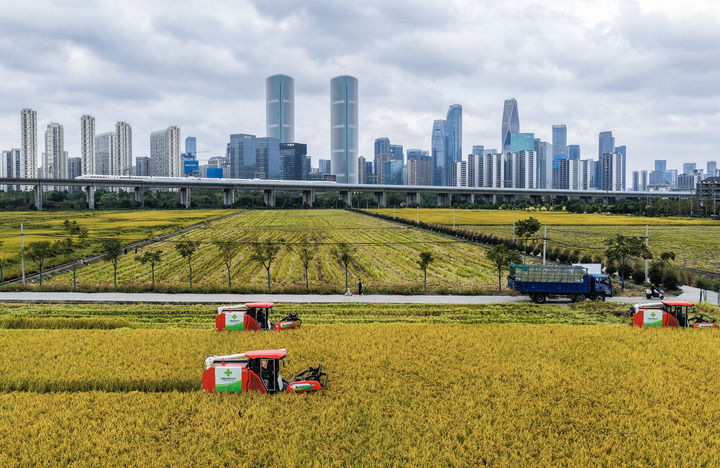 收割機在位于浙江杭州蕭山區(qū)世紀田園糧食功能區(qū)的稻田里收割水稻,遠處高鐵列車飛馳而過(2025年10月21日攝,無人機照片)。新華社記者 徐昱 攝