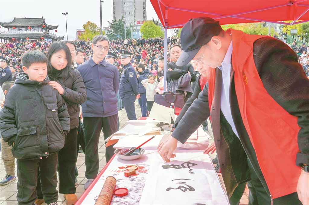 市集不僅有宣傳與服務(wù),更有可看可學(xué)的文明實(shí)踐?;顒?dòng)通過宣傳展板集中展示漢濱區(qū)移風(fēng)易俗成果與文明新風(fēng)先進(jìn)典型事跡,用身邊人、身邊事帶動(dòng)群眾。非遺代表性傳承人現(xiàn)場詮釋勤儉美德,書法愛好者現(xiàn)場書寫福字與家訓(xùn),讓群眾在傳統(tǒng)文化熏陶中,潛移默化地接受新風(fēng)教育。“非遺、書法和移風(fēng)易俗結(jié)合得好,孩子也能受教育?!睅е⒆庸涫屑氖忻窭钆渴斋@滿滿、笑意盈盈。