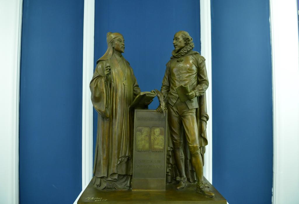 這是中國(guó)江西撫州湯顯祖紀(jì)念館陳列的湯顯祖遇見莎士比亞銅像(2016年10月12日攝)。新華社記者 周密 攝