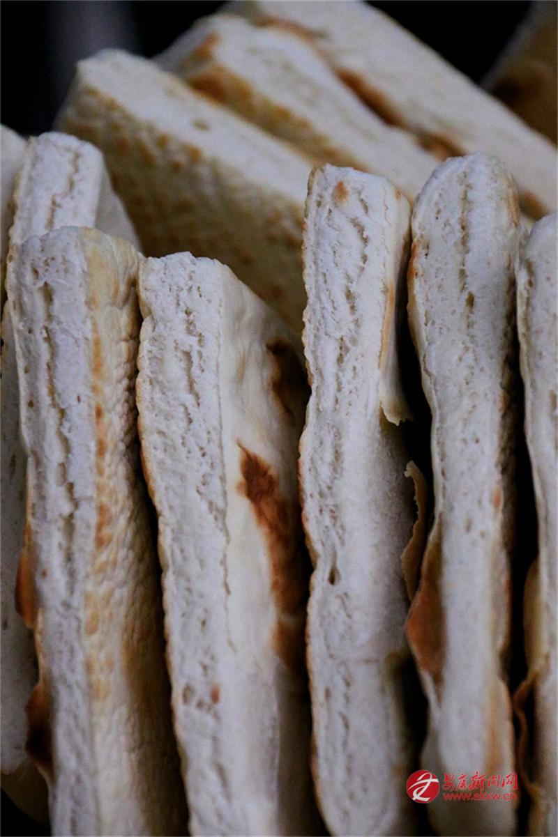 安康的牙牙兒饃是發(fā)面的。發(fā)面,在北方多用于蒸饅頭、包子,用來打饃且泡在湯里吃的,似乎不多見。安康人卻偏偏這么做了。面粉加了酵母,醒得恰到好處,不能太酸,也不能太生,揉成團(tuán),搟成圓,在鏊子上烙?;鸷蛞m中,兩面烙得焦黃,帶著些許褐色的斑點,像是虎背上的花紋,雖不如西安饦饦饃那般白凈,卻多了一股子麥香和火氣。